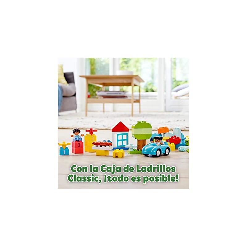 Incluye 65 ladrillos, así como elementos reconocibles para estimular la mente de los bebés, como un coche con ruedas que giran, un tejado, una ventana, flores, pan, figuras DUPLO de personas y ladrillos para aprender los números 1, 2 y 3.
