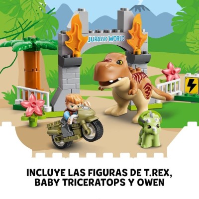 Cuando un T.rex irrumpe a través de las puertas de Jurassic World, los fanáticos de los juguetes de dinosaurios deben ayudar a Owen a rescatar al bebé triceratops y llevarlo a un lugar seguro en su motocicleta. Desde las puertas que se abren de la entrada hasta la boca que se abre del T.rex y la valla de alto voltaje hasta la genial moto de juguete, este juguete de dinosaurio T.rex para niños pequeños está repleto de acción emocionante y características divertidas que desarrollan las habilidades de construcción y pensamiento creativo de los niños y alimentar su imaginación.