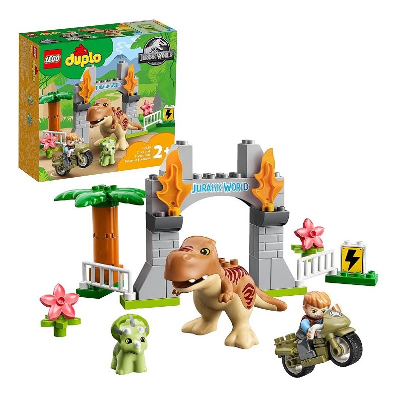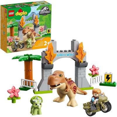 Este LEGO DUPLO Jurassic World Fuga del T. rex y el Triceratops (10939) juguetes para niños 2 años está repleto de funciones divertidas y la acción de la película Jurassic World hará rugir de alegría a los niños amantes de los dinosaurios.