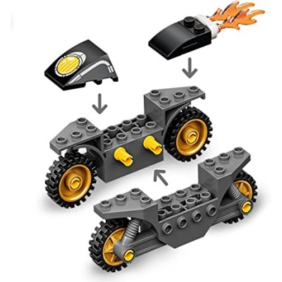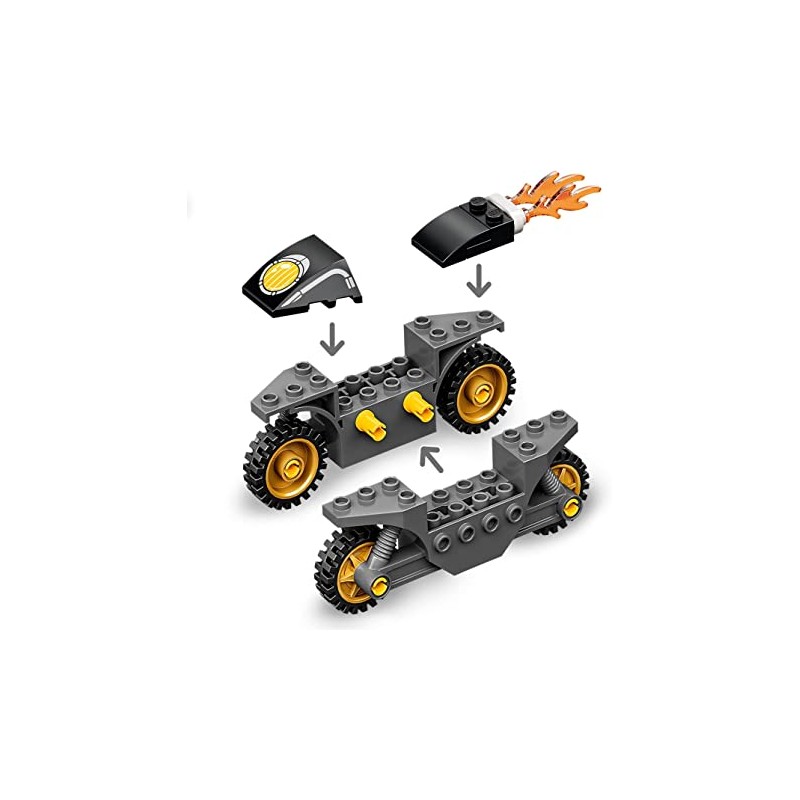 Este set de superhéroes LEGO contiene una moto de juguete para construir y un disparador de discos con un desintegrador desmontable para infinitas batallas del bien contra el mal