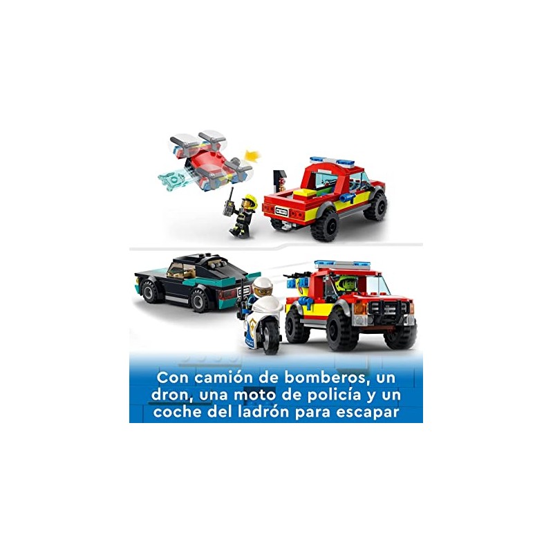 Este juguete de policías y bomberos incluye varios vehículos de emergencia: una furgoneta con un dron, una moto de policía, un coche para los ladrones y una pequeña estación con un semáforo