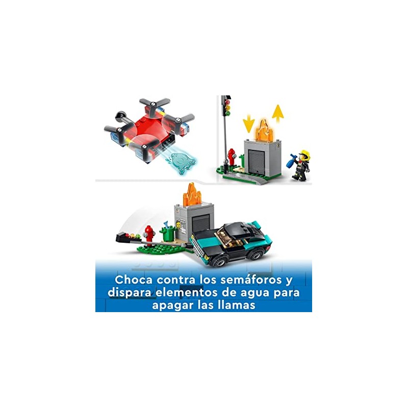 Los peques podrán disparar elementos de agua desde el dron, activar las luces del semáforo y levantar y bajar las llamas LEGO en el lugar del incendio