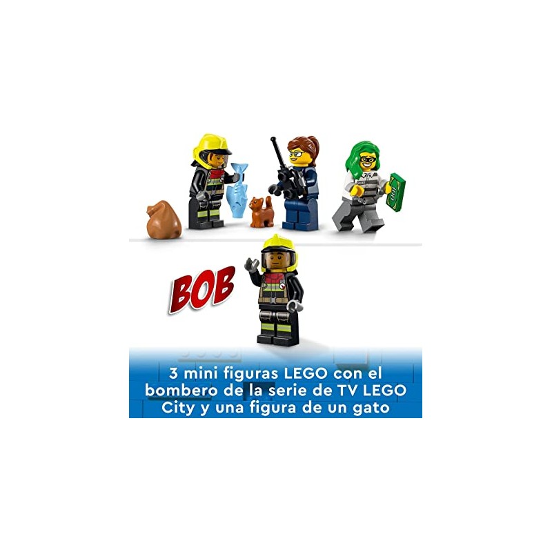 El set de construcción también cuenta con 3 mini figuras LEGO, entre ellas el Bob, el bombero de la serie de TV LEGO City Aventuras en la Ciudad, y la figura de un gato de juguete para llevar a cabo imaginativas historias