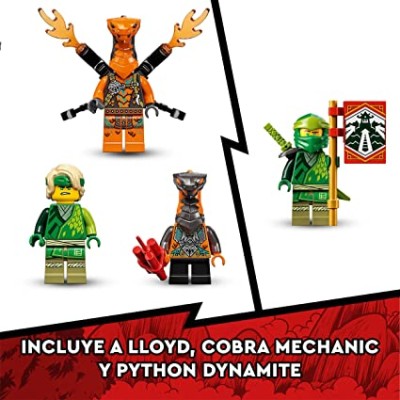 Incluye la figura de NINJAGO Lloyd armado con una espada, a Mecánico Cobra sobre un quad con un lanzallamas, y a Pitón Dinamita con una pistola y un cartucho de dinamita