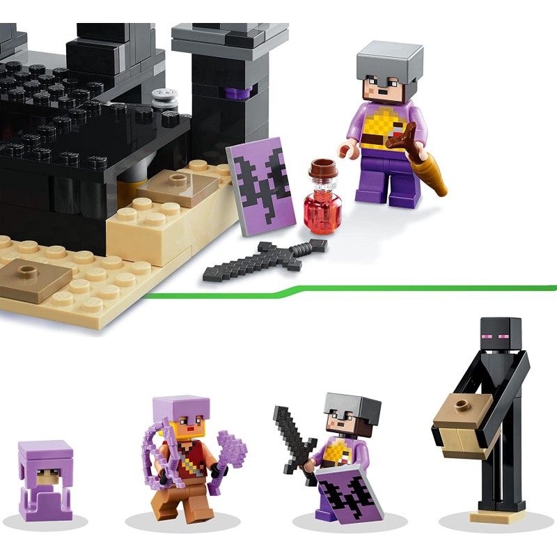 Los peques podrán vivir la batalla entre el Guerrero del End y un Arquero Dragón ambos equipados con armadura y armas de juguete en el legendario End Arena, ¡también incluye las figuras LEGO de un Enderman y un Shulker!