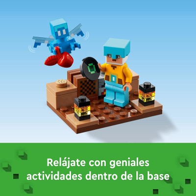 Este juego de batalla y acción incluye mini figuras LEGO de populares personajes del videojuego como un soldado centinela, un guerrero guardián, un Allay, un esqueleto, un Creeper y un cerdo de juguete