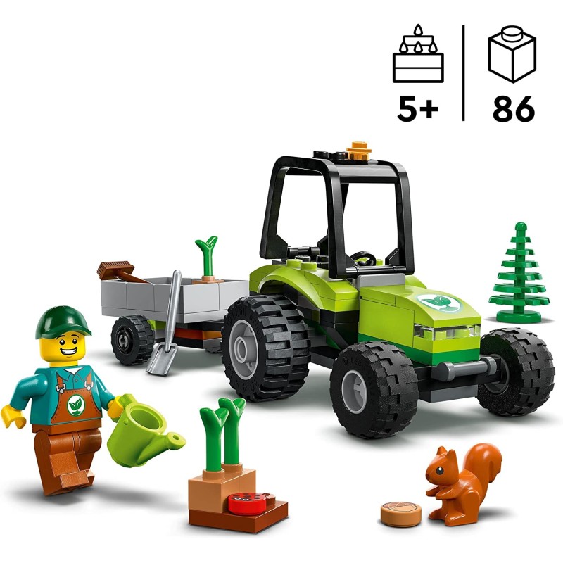 Este set LEGO City cuenta con un divertido tractor de juguete con remolque, un árbol, arbolitos, accesorios de jardinería, una mini figura LEGO de un jardinero y animales de juguetes para que los niños vivan increíbles aventuras de reforestación