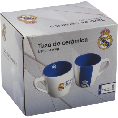 REAL MADRID: Taza para que cualquier madridista pueda disfrutar de su desayuno con los colores de su equipo. CARACTERÍSTICAS: Diseñada con elementos icónicos del Real Madrid en el exterior que contrastan con su interior azul. Capacidad 380 ml. Apta para microondas y lavavajillas. Presentada en caja individual.