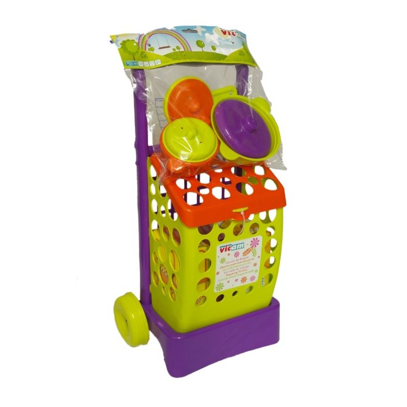 CARRITO+ALIMENTOS+ACCESORIOS vicam Colorido carrito de plástico que incluye una completa vajilla para jugar a las comiditas, puedes llevarlo donde quieras gracias a sus ruedas.