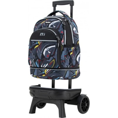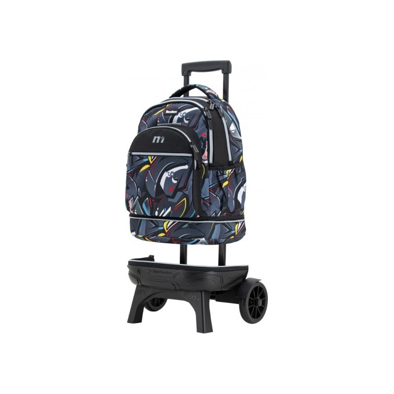 Mochila escolar con carro desmontable. 2 usos en 1: el uso de Carro fijo de base resistente. Con dos ruedas grandes y silenciosas para lograr un mejor movimiento y estabilidad. La posición e inclinación de sus dos patas delanteras evitan el volcamiento del carro y el otro uso de solo mochila, pues se puede separar del carro a traves de la cremallera que los une. Tiene dos compartimientos amplios y un bolsillo frontal con un organizador interno. Tirantes ergonómicos de espuma transpirable con velcro al final que se adhieren al espaldar para que no se arrastren por el suelo. Bolsillo en el lateral derecha para llevar una botella . Asa acolchada de agarre superior.