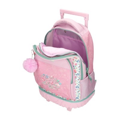 Mochila de 32 cm x 43 cm x 21 cm fabricada en Poliéster. Dos compartimentos ideales para organizar libros, libretas, carpetas y carpesanos de tamaño DIN A4. Bolsillo frontal para los pequeños accesorios y el material escolar y dos bolsillos laterales para guardar la botella y el paraguas. Doble rueda para mejorar el rodaje de la mochila y aportar una mayor resistencia.