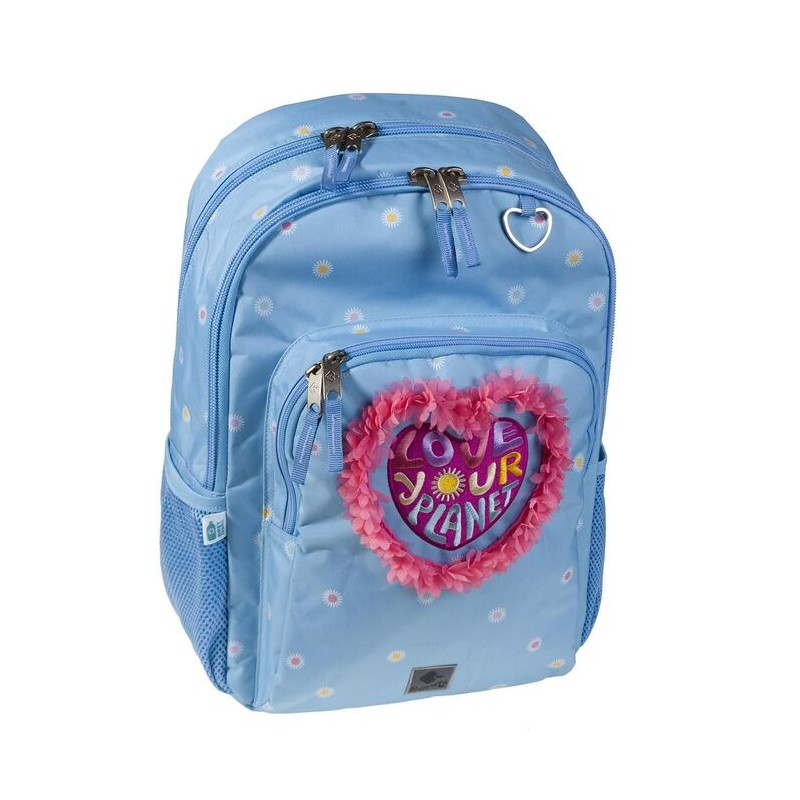 mochila escolar doble LOVE PLANET tiene dos bolsillos principales para llevar libros, libretas y carpetas. El segundo bolsillo, el más cerca de la espalda, es más estrecho y está acolchado, pensado para poder llevar un ordenador portátil, tabletas u otros dispositivos delicados. También tiene bolsillo frontal de tamaño pequeño. Dispone de correas de transporte regulables y acolchadas. Espaldera acolchada y asa superior de transporte. Base acolchada para soportar el peso del contenido. Esta mochila está preparada para carro porta-mochilas, con túnel dorsal más elementos de sujeción. Exterior: 100% Poliéster con revestimiento impermeabilizante. Forro: 100% Poliéster.