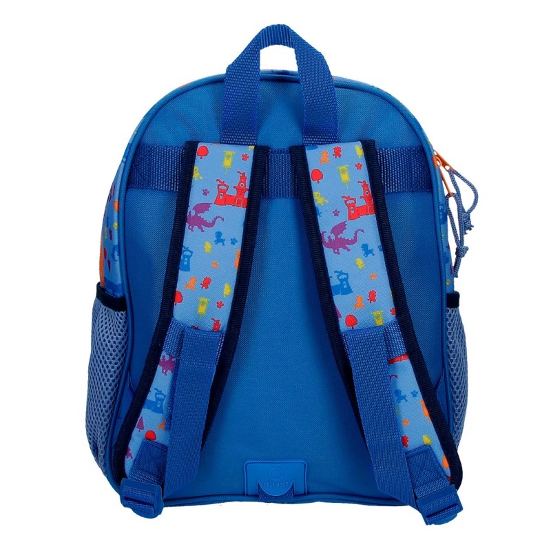 Mochila de 27 cm x 33 cm x 11 cm fabricada en Poliéster. Dos bolsillos laterales para guardar la botellita de agua o el almuerzo.Bolsillo frontal para guardar perqueños accesorios.Tirantes anchos, ergonómicos y acolchados que se adaptan perfectamente a la espalda y posibilidad de incorporarle un carro opcional gracias al sistema Magic Fix que permite una mayor sujeción de la mochila al carro.