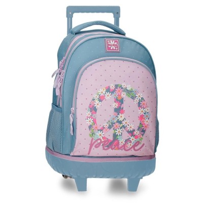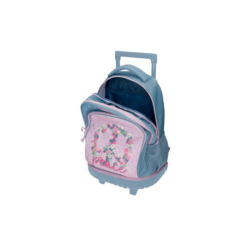 Mochila de 32 cm x 43 cm x 21 cm fabricada en Poliéster. Dos compartimentos ideales para organizar libros, libretas, carpetas y carpesanos de tamaño DIN A4. Bolsillo frontal para los pequeños accesorios y el material escolar y dos bolsillos laterales para guardar la botella o el paraguas.