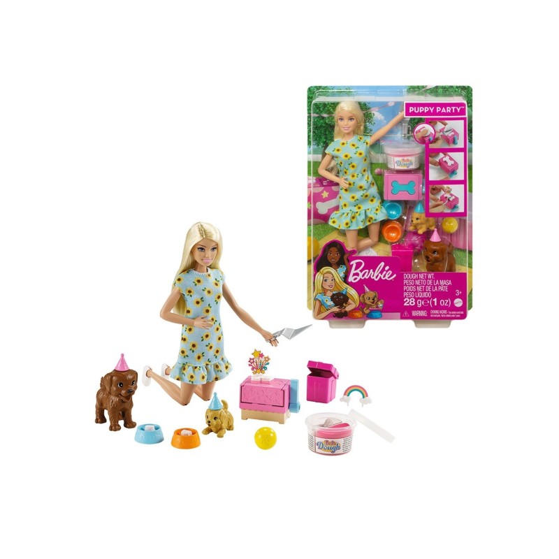 ¡Barbie® va a celebrar una fiesta para sus cachorritos, y las jóvenes imaginaciones están invitadas a unirse a la diversión! Viste a cada cachorro con su sombrero de fiesta, y luego ayuda a Barbie® a llenar el molde de pastel con uno o los dos colores de la masa incluida. ¡Empuja la palanca para ver cómo «sube» la masa y se convierte en un adorable pastel en forma de hueso! Las niñas pueden decorar las golosinas con los adornos de pastel incluidos y servirlas a los cachorritos de Barbie® en coloridos cuencos de perrito. Hay una caja de regalo que esconde una pelota para sus cachorros, y el cachorro más grande puede «masticar» cuando las niñas le aprietan la cola. Con unas características tan dulces, este conjunto de fiesta para cachorros Barbie® es un gran regalo para niñas de 3 a 7 años. La muñeca no puede tenerse en pie por sí sola. Los colores y la decoración pueden ser distintos de los mostrados.