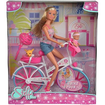 Esta es Steffi Love con Bicicleta de Simba. Si te gustan los paseos en bicicleta y la naturaleza esta es la muñeca ideal para ti. La bicicleta es blanca y rosa. Esta lleva una cestita para llevar al perro y un asiento para el bebé. Además, viene un casco para que Steffi no corra ningún peligro. Incluye el bebé y el perro. Edad recomendada +3A. Simba. Ref.: 5739050