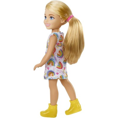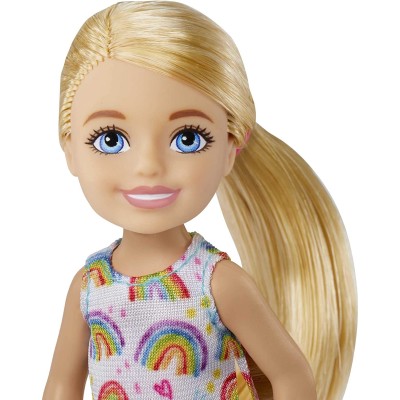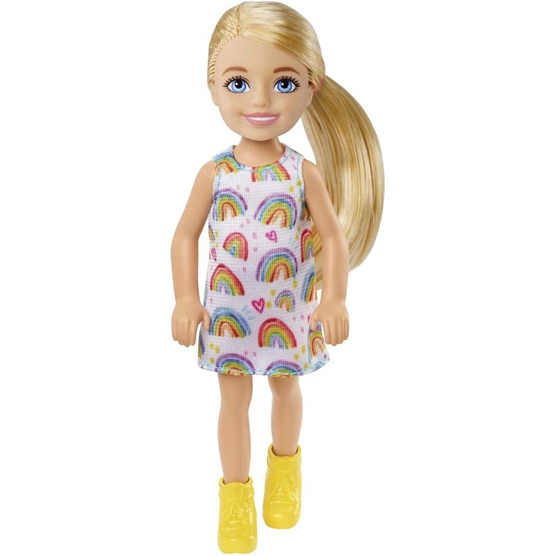 Esta muñeca Chelsea de 6 pulgadas es súper linda en un vestido blanco con un adorable estampado temático de corazones y arcoíris.