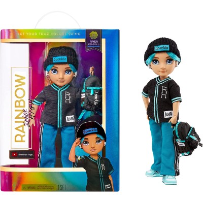 CONOCE A RIVER - River Kendall viene vestido de TURQUESA de pies a cabeza. Su rostro es joven, viene con ropa llena de detalles, pelo corto turquesa, largas pestañas y ojos de cristal.