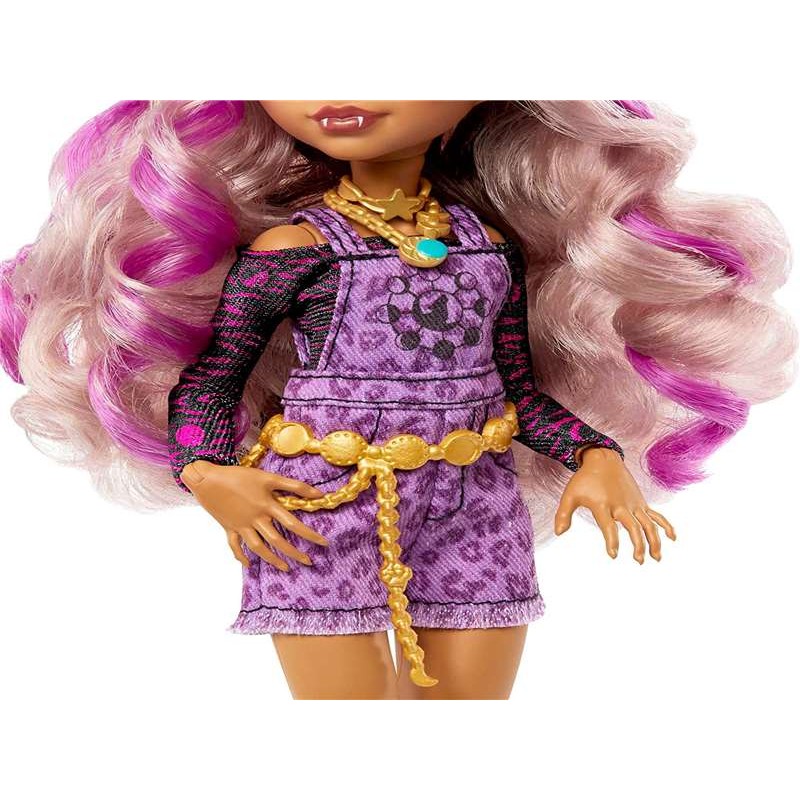 Lleva el look de la muñeca Clawdeen Wolf al siguiente nivel con un feroz chaleco de piel sintética y accesorios espeluznantes, como un bolso, un peine, un sándwich de helado con forma de luna, un aperitivo y un smartphone.
