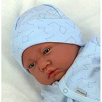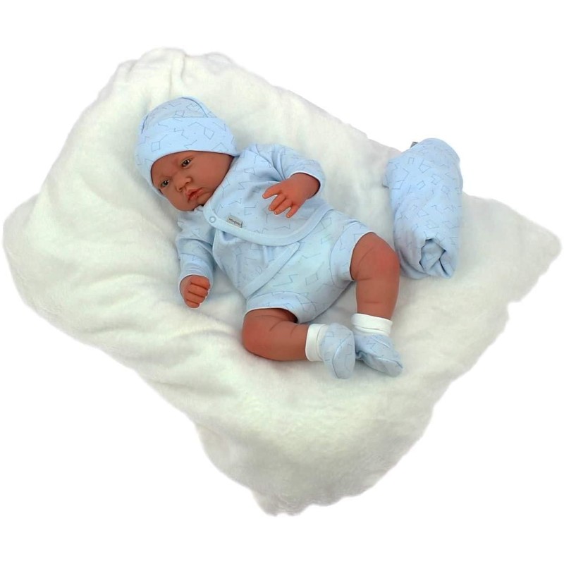Lleva un conjunto de primera puesta en tono azul claro, gorrito y calcetines incluidos