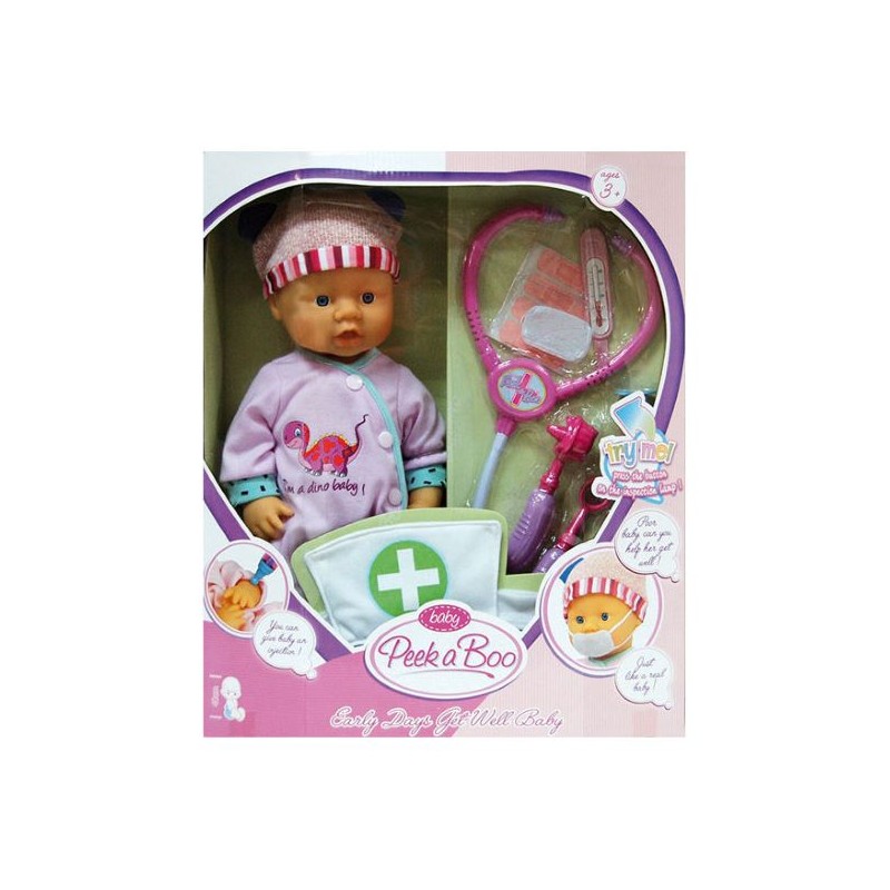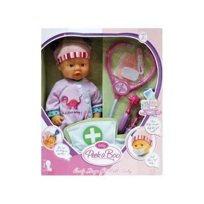 Muñeco de 40 cm con gran variedad de complementos de doctor para jugar a los médicos. ¡Aprieta el botón del fonendoscopio! Tiene sonidos incorporados. Además podrás poner una inyección a nuestro bebe gracias a la jeringuilla que también viene incorporada.