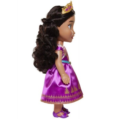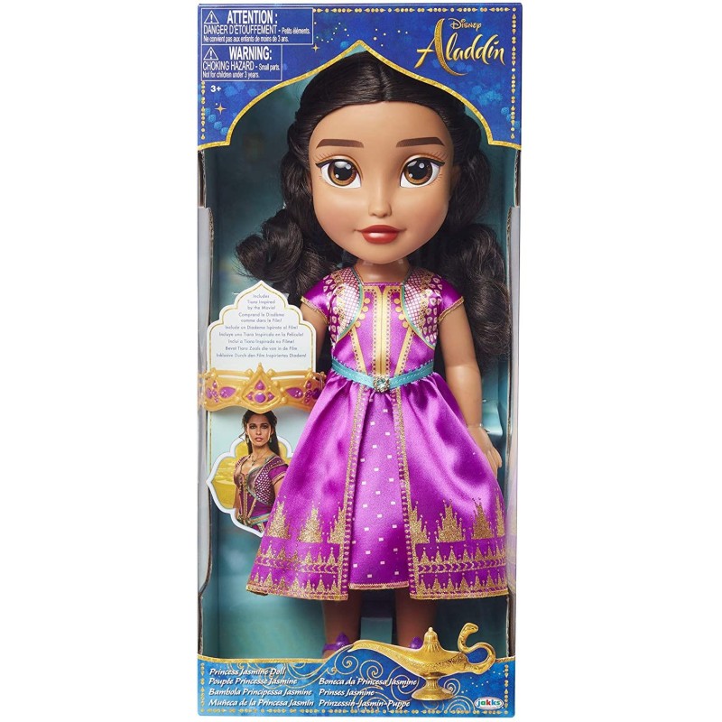 Adéntrate en el mundo de la fantasía de aladdín con la muñeca jazmine de la colección princesas disney. Su sensacional vestido azul con adornos en tul te transportarán a un "mundo ideal"; la muñeca jazmine mide 35 cm, es articulada e incluye un par de zapatos y una mini corona.
