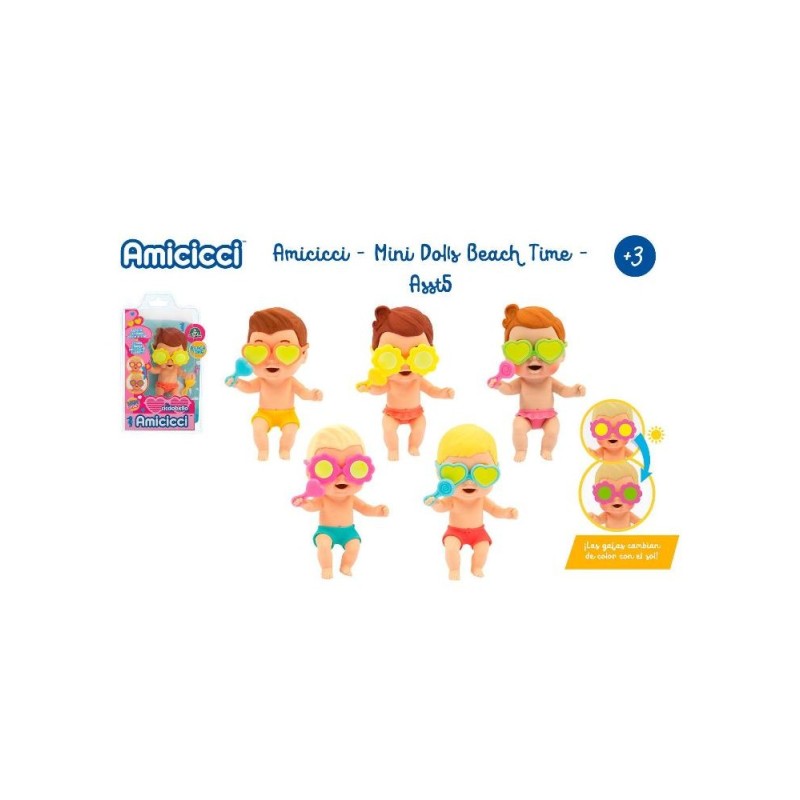 Amicicci Beach Time es un surtido de bebés Amicicci que incluye un muñeco de un bebé niña o un niño Amicicci. Hay 5 modelos diferentes: 2 niños rubios, uno castaño, y 2 niñas una castaña y otra pelirroja. Cada Paquete incluye accesorios divertidos de verano. Van vestidos con un bañador de colores extraíble e intercambiable y unas gafas de sol divertidas en forma de corazón o de flor. Además tiene un sonajero para jugar. Los Amicicci son unos pequeños bebés muy flexibles hechos hechos de un material blandito y divertido. Son casi como un bebé de verdad. Los Amicicci hacen increíbles movimientos flexibles y hacen expresiones faciales tiernas y divertidas al presionarle las mejillas.