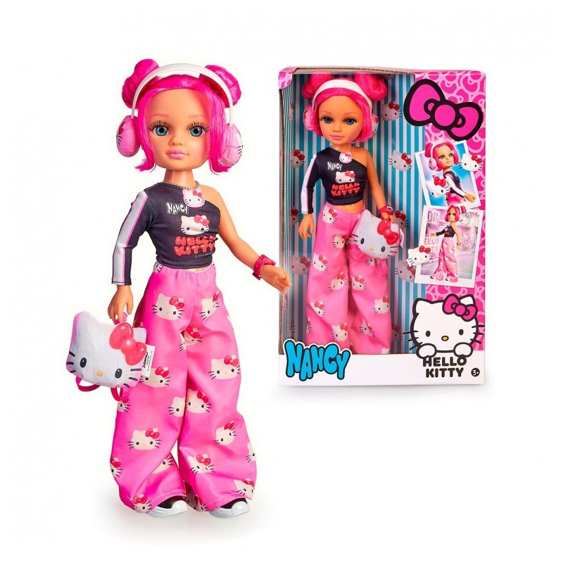 Nancy se une a Hello Kitty con un look moderno y lleno de actitud. Su cabello rosa en moños altos y su outfit urbano con camiseta negra y pantalones anchos reflejan las últimas tendencias. Además, su mochila y auriculares inalámbricos la hacen la compañera ideal para disfrutar de la música y la moda.