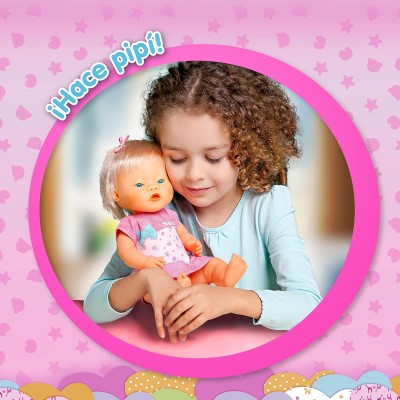 Esta encantadora muñeca de 35 cm con cuerpo duro tiene el pelo rubio y un adorable lacito rosa que la hace lucir aún más hermosa. ¡Su bonito vestido rosa con florecitas le da un toque de estilo único! Pero eso no es todo, ¡Nenuco Síndrome de Down tiene una sorpresa! Puede beber y hacer pipí