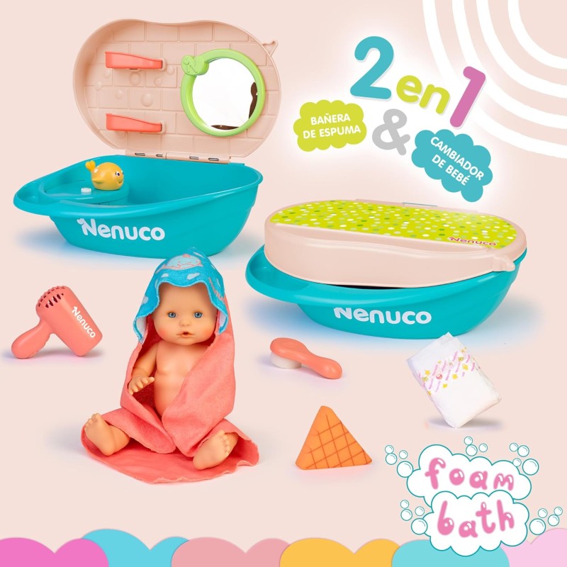 Nenuco Baño de Espuma incluye una innovadora bañera 2 en 1 que no solo permite un baño relajante, sino que también genera espuma real. ¡Transforma el tiempo de juego en una experiencia de spa con burbujas para tu muñeco bebé!