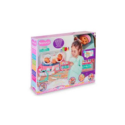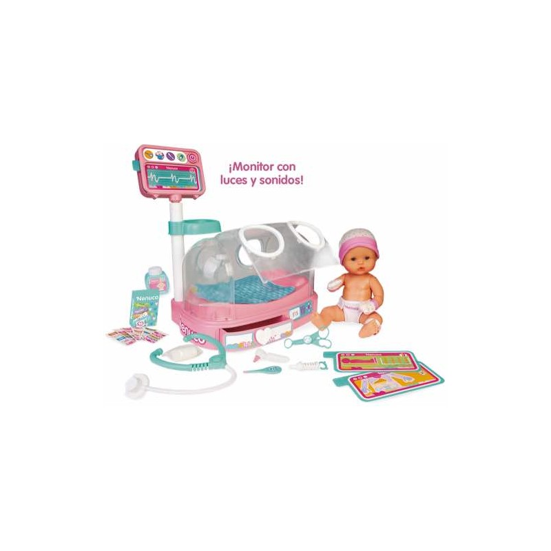 Doctora, ¿cómo está mi bebé? Incluye un Nenuco recién nacido con nuevos accesorios y una incubadora con un Monitor New Born electrónico para cuidarlo. La incubadora es electrónica e incluye 3 tarjetas diferentes que son análisis diferentes con luces y sonidos de verdad. Accesorios: una pulsera de recién nacido, 3 análisis, una tijera de mezcla para bebés, una vacuna, un termómetro, una venda, un estetoscopio, un otoscopio y biberón. Nenuco es un muñeco de 35cm de cuerpo duro con ropa de recién nacido: gorro, guantes de bebé y pañal. Puede beber agua.