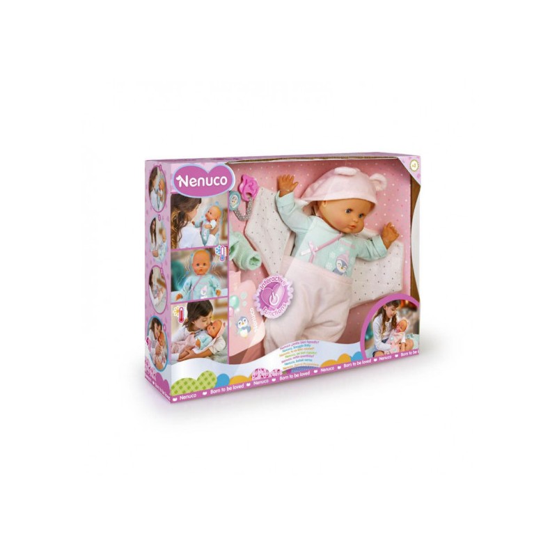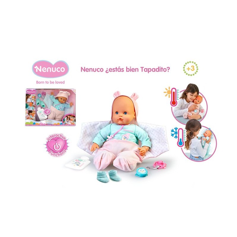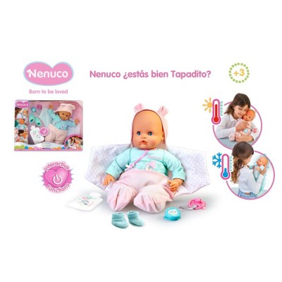 El juguete contiene un muñeco bebé Nenuco grande de 42 centímetros con cuerpo blando, vestido con una pijamita azul de tela no intercambiable con otras prendas De la colección de cuidados médicos de Nenuco sale este juguete con luz y movimiento; para que tu muñeco esté sano, tienes que regularle la temperatura con su manta y ropita El pack incluye varios accesorios como un chupete con chupetero para mantenerlo colgado en su ropita, unos patuquitos y una bolsa de agua de juguete, además de la mantita para arropar a Nenuco Si Nenuco tiene frio empezará a temblar, para que pare tienes que taparle con su mantita, ponerle la capucha con orejitas, y la bolsa de calor y si la frente de Nenuco se pone rojita, significa que tiene mucho calor y debemos regular de nuevo su temperatura quitándole la ropita