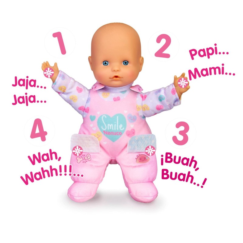 Si aprietas sus manitas Nenuco dice mamá y papá o hace sonidos de bebé