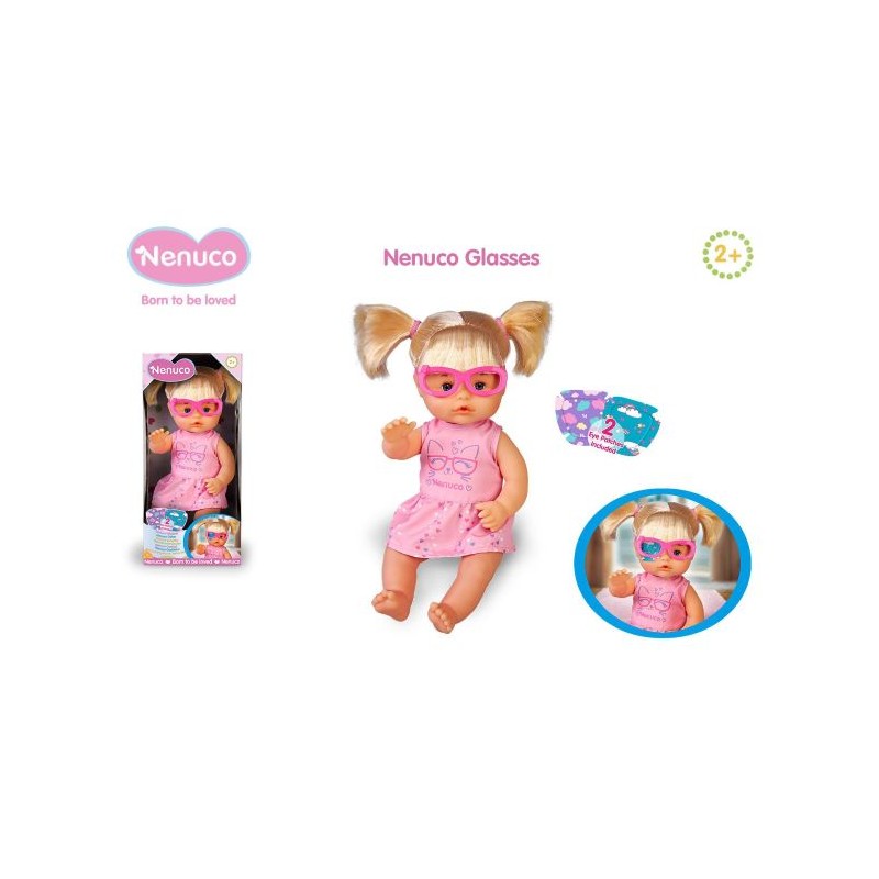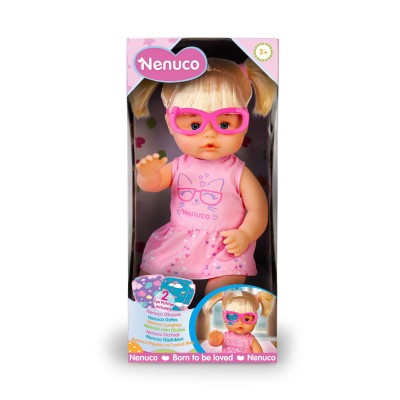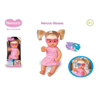 Nenuco de 35 cm y cuerpo duro; va vestida con un vestido rosa decorado con un gatito y gafas
