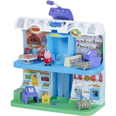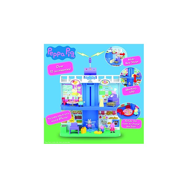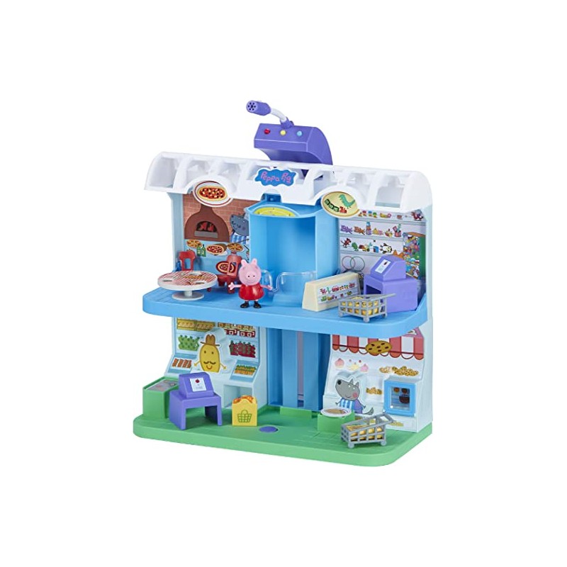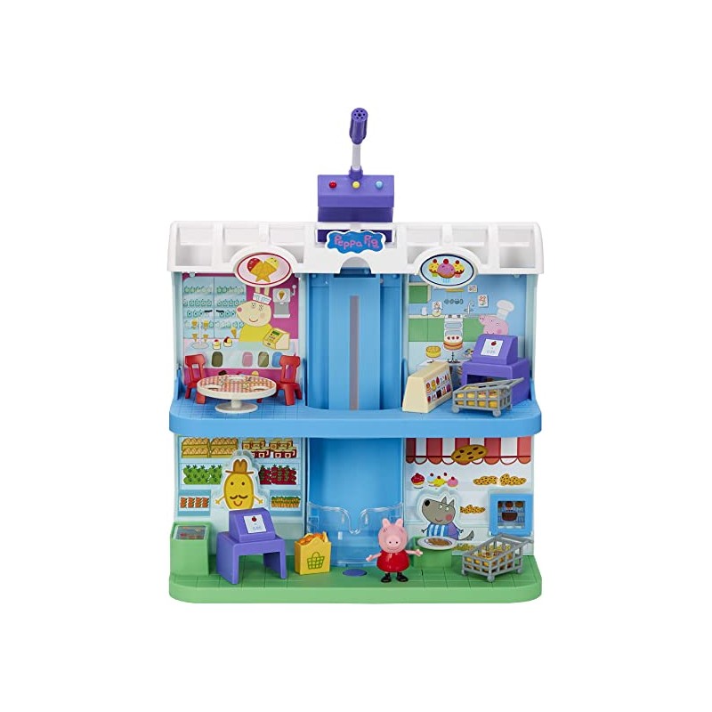 Tiene 8 tiendas diferentes para jugar y más de 12 accesorios: Mesa giratoria, 2 x Sillas, 2 x Cajas registradoras, 2 x Carritos de la compra, 2 x Cajas de comida, Mostrador, Bolsa de la compra y plato de Galletas