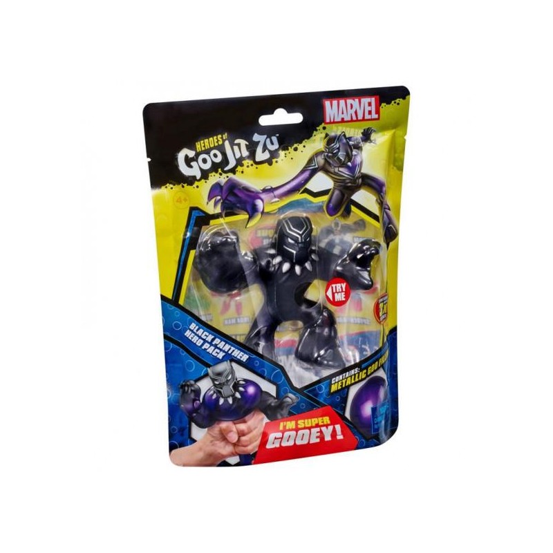¡Tus personajes de Marvel favoritos se han convertido en Heroes of Goo Jit Zu! ¡Héroe Marvel de Pantera Negra súper pegajoso con relleno de gel púrpura único! ¡El cuerpo de Black Panther se estira 3 veces su tamaño y vuelve a su forma original! ¡También disponible Hulk, Spider-Man, Groot, Venom y Iron Man en una forma que nunca antes habías visto! ¡Una nueva forma de jugar y salvar el día con estos geniales juguetes coleccionables!