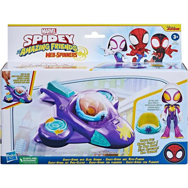 Spidey y su Superequipo - Ghost-Spider con planeador, una figura articulada de Ghost-Spider de 10 cm y su vehículo equipado con función de rotación para luchar contra los malos. ¡Únete a la carrera para salvar el mundo pilotando un jet planeador con telarañas! La figura de Ghost-Spider de 10 cm viene con un traje Web-Spinner actualizado y un casco extraíble. El planeador tiene una decoración única que combina con el superhéroe Ghost-Spider. ¡A los fans de Spidey de 3 años en adelante les encantará la acción de girar los motores con telaraña! Edad recomendada: + 3 años