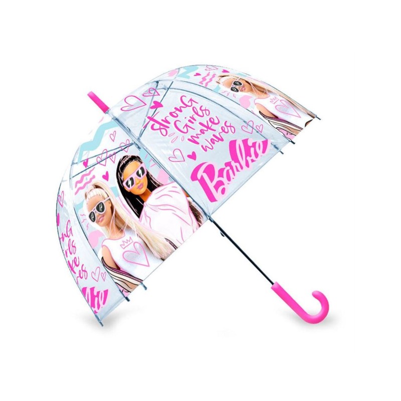 Paraguas transparente printado de Barbie. Tu peque va a querer que llueva todos los días para salir acompañado de este paraguas de 46 cm de diámetro. Tiene forma acampanada que mejora la parada del agua y evita que se moje. Además, su varilla larga con el mango en forma de gancho hace que tenga un fácil transporte y sujeción. ¡Y se abre automáticamente apretando un botón!
