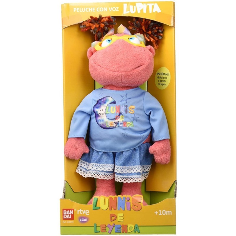 Peluche con música y voz de Lupita, de los Lunnis de Leyenda Suave y blandito peluche con frases de la serie Dimensión más de 35 cm Incluye dos canciones de la serie: Gara y Jonai y Cervantes Vestida con camiseta de rayas boardada y faldita vaquera