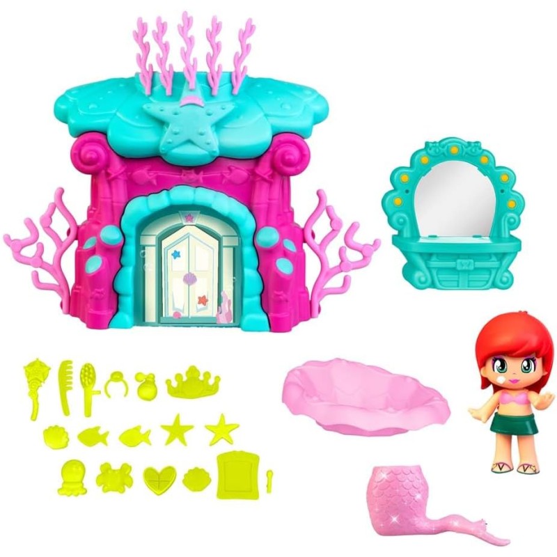La casita de fantasía de la sirenita Pinypon está diseñada con detalles encantadores, incluyendo un asiento en forma de concha y un tocador con espejo, todo ello permite recrear la vida bajo el mar