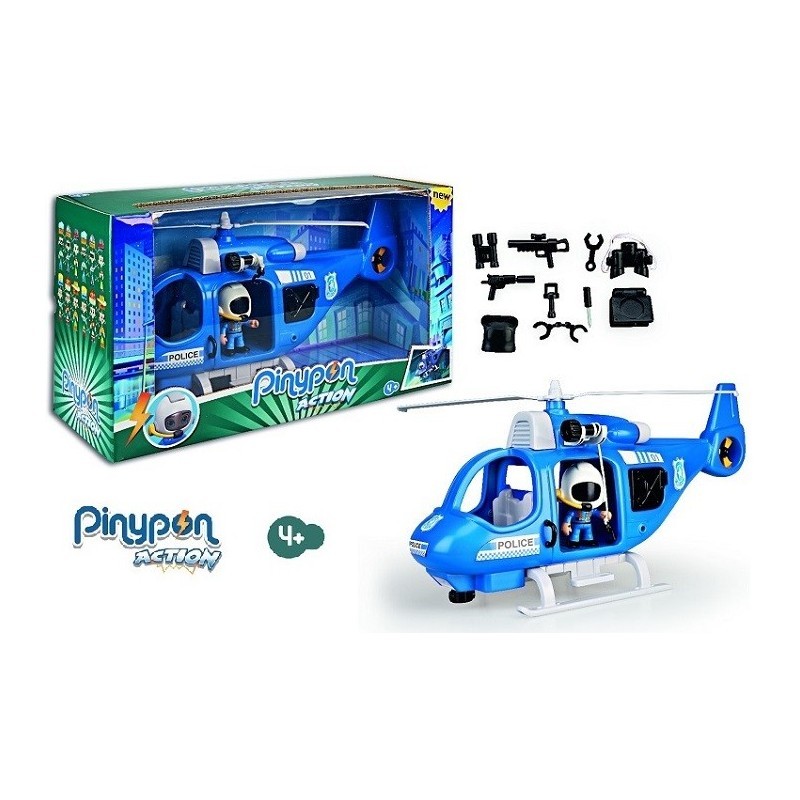 Helicóptero completo con muchos accesorios y una figura de pinypon action; el piloto policía