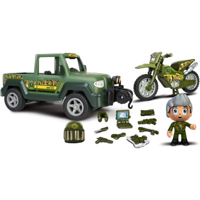 Set completo de 2 vehículos de Fuerzas Especiales de Pinypon Action. El pickup tiene una polea para remolcar y una baca arriba para transportar materiales. La moto tiene pata de cabra para sujetarlo. Incluye una figura Pinypon Action Fuerzas Especiales y pequeños accesorios.