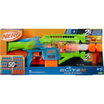LANZADOR MOTORIZADO NERF ELITE 2.0 DOUBLE PUNCH CON CAÑONES ALTERNANTES: ¡Dos cañones! El lanzador Nerf Elite 2.0 Double Punch cuenta con 2 cañones que se mueven hacia adelante y hacia atrás rápidamente mientras lanzas