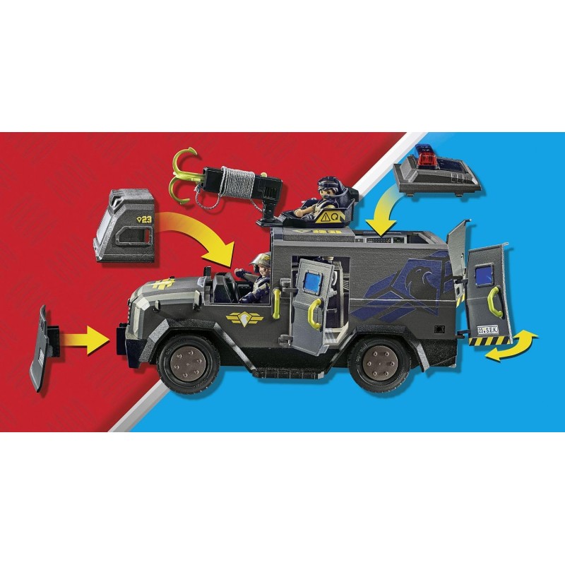 ¡Experimenta persecuciones llenas de acción con el vehículo todoterreno SWAT! Gracias a su suspensión en las cuatro ruedas, el vehículo puede desplazarse sin esfuerzo por terrenos abruptos.