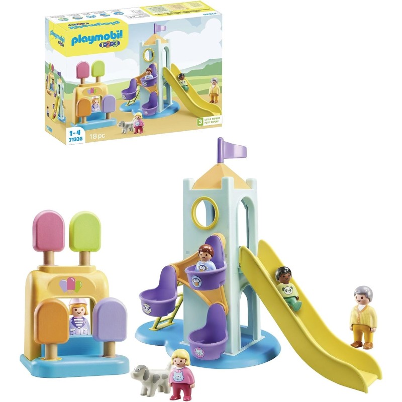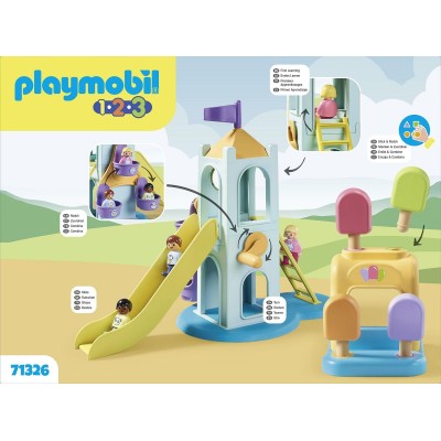 Contenido: Figuras: 1 adulto, 1 vendedor de helados, 2 figuras infantiles; Animales: 1 perro; Accesorios: 1 torre de aventuras con noria y tobogán, 1 placa base, 1 escalera, 1 bandera, 1 puesto de helados, 4 palos de colores diferentes.