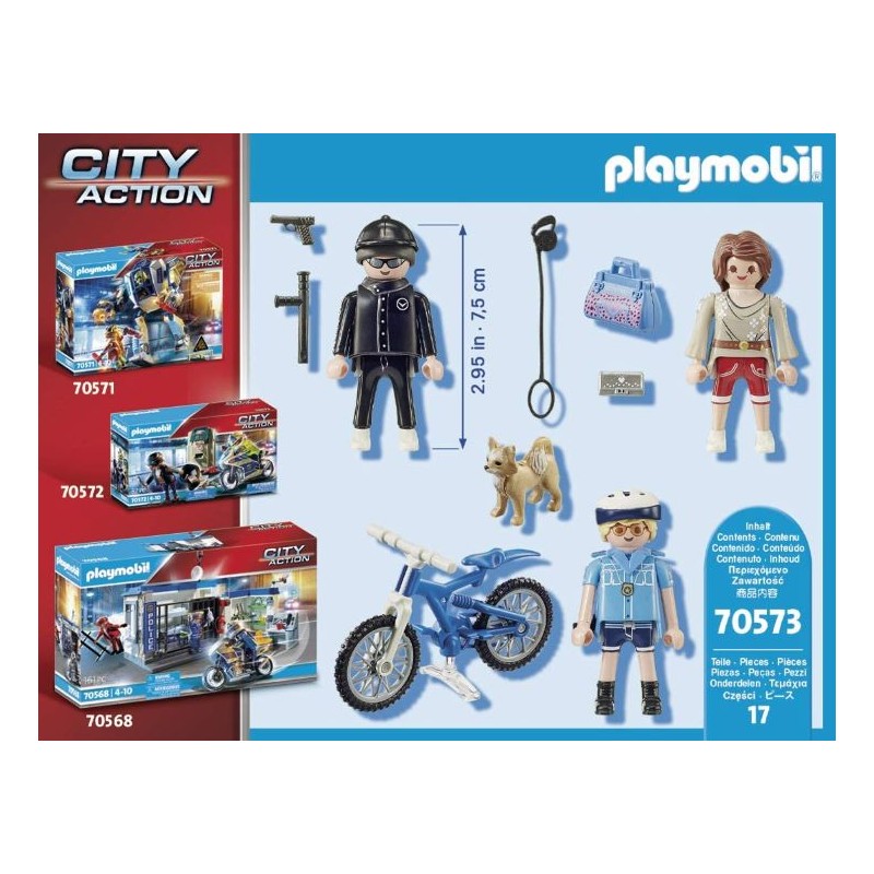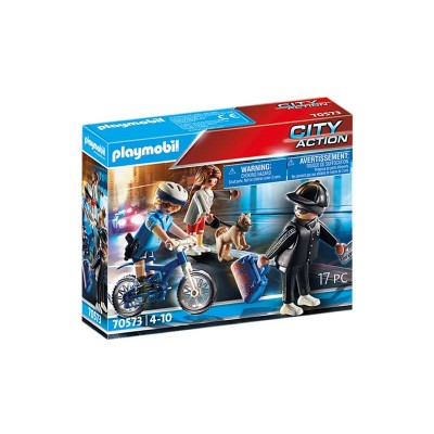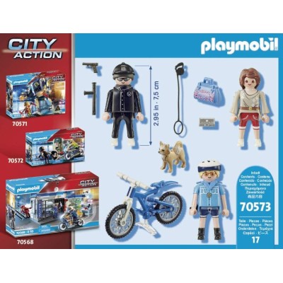 Contenido: 1x PLAYMOBIL City Action Bici Policial: Persecución del carterista, Juego de 17 piezas con instrucciones: 1 bicicleta, 3 figuras, 13 accesorios, Material: plástico, Se puede montar individualmente, Peso: 53 g, 70573