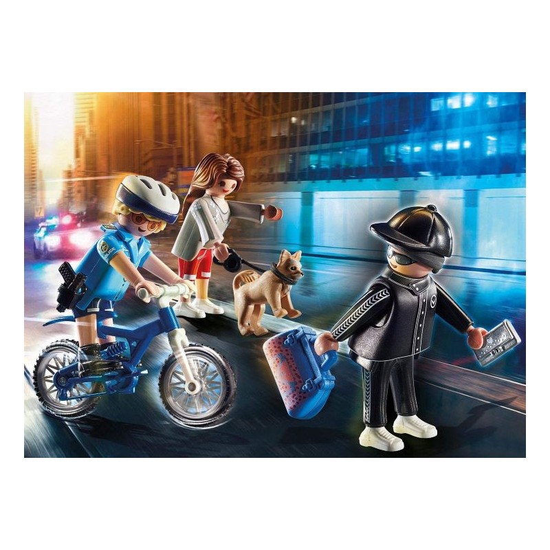 1 mujer joven con perro con correa, 1 ladrón con casco desmontable, 1 policía con casco y funda desmontables y 1 bicicleta y mucho más.