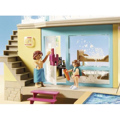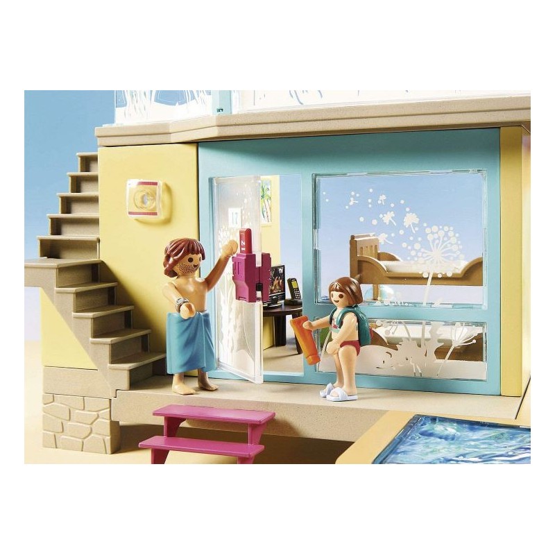 Diversión en vacaciones con toda la familia: bungalow PLAYMOBIL con piscina, tobogán, terraza para tomar el sol, 4 veraneantes así como accesorios para recreaciones detalladas