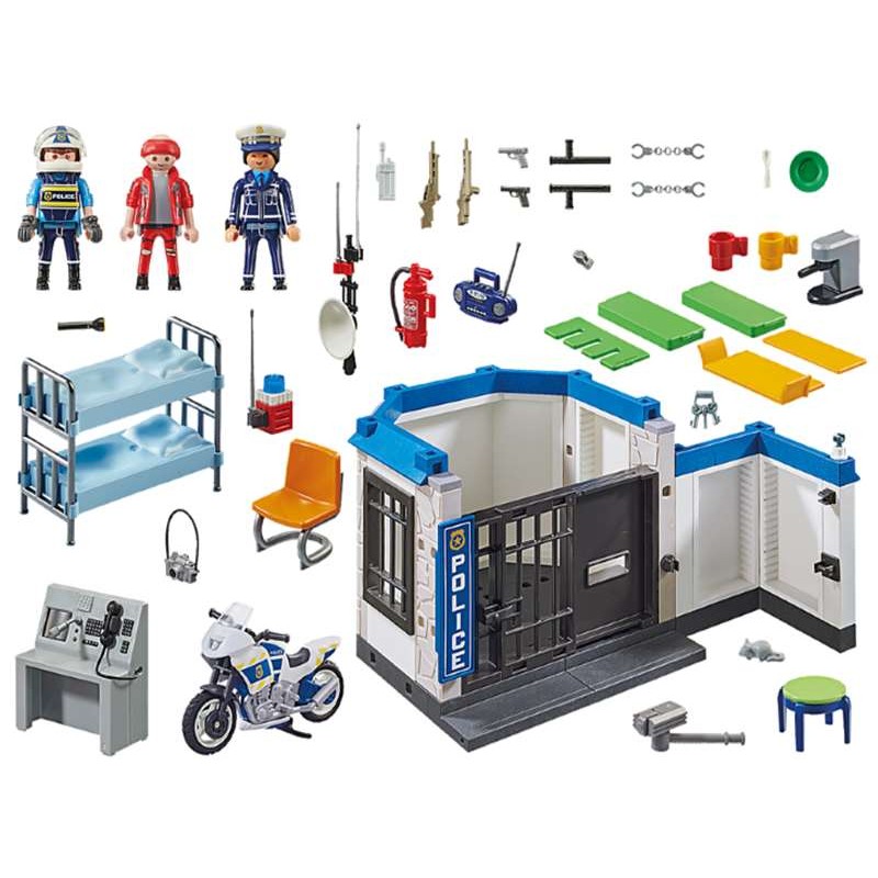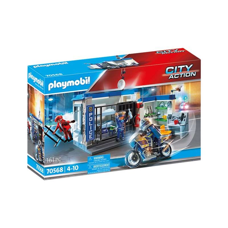 Misión para la policía: fuga de prisión PLAYMOBIL con policía, mujer policía, delincuente, moto y accesorios para una recreación detallada - Edificio con antesala y celda para 2 presos: reja con puerta corredera con cerradura, litera doble, ventana de reja con parte de reja de ruptura y mucho más. - Juego de figuras para niños a partir de 4 años: Ideal para el tamaño de sus manos y bordes redondeados agradables al tacto - Para jugar a diario: Incluye instrucciones para montarlo con ayuda de los padres, Alta calidad y diseño robusto, Limpieza de las piezas (sin pegatinas) con agua corriente y sin químicos - Contenido: 1x PLAYMOBIL City Action Policía: Fuga de la cárcel, Set de 161 piezas con instrucciones: 1 edificio, 1 moto, 3 figuras, 156 accesorios, Material: plástico, LxDxH Edificio (sin antenas): 28x23,5x15 cm, Peso: 773 g, 70568