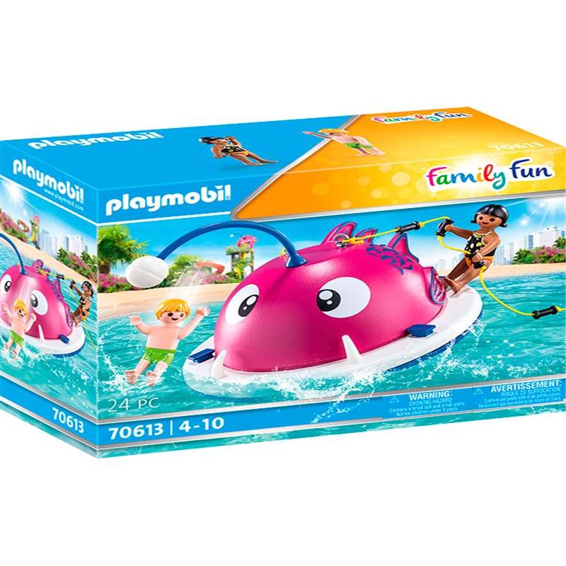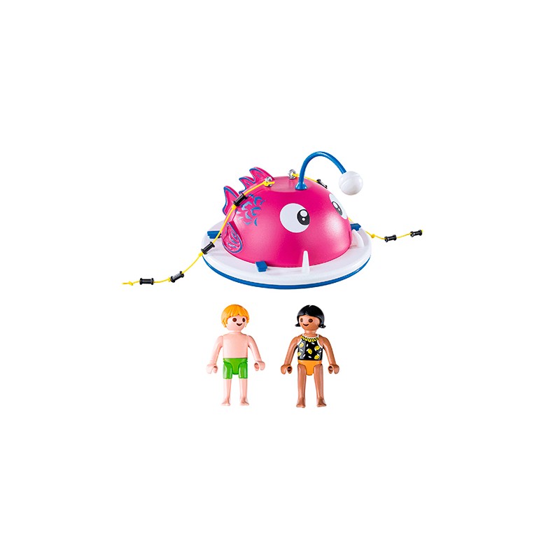 No hay mejor lugar para chapotear, trepar y retozar que la isla de escalada. No es fácil subir a la gigantesca cabeza del pez rosa, solo hace falta un poco de práctica. Primero se sube a la cima de la isla y luego se lánzate de nuevo al agua. Incluso cuando empieza a oscurecer, los niños no se cansan de esta diversión acuática de escalada. Qué bien que los dientes de los peces y la bola de la linterna brillen en la oscuridad. El set de juego consta de una isla de escalada con aspecto de pez y dos figuras PLAYMOBIL en bañador.